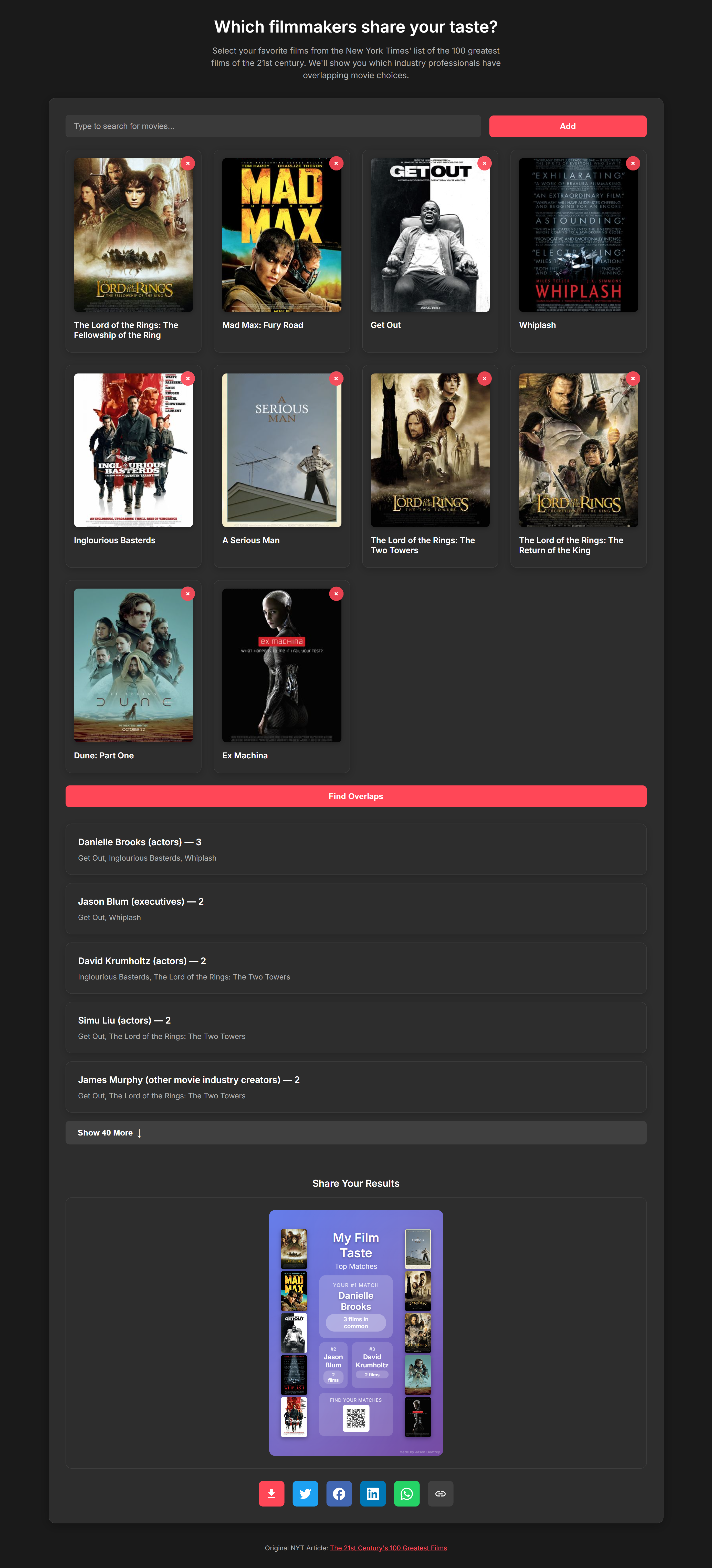 So, I made a little static site where you and I can do just that. If you are curious which moviemaker your personal taste most overlaps with, go to the website, enter your top 10 movies (constrained to the list of movies selected by the NYT influential creators), and see who you have the most overlap with.